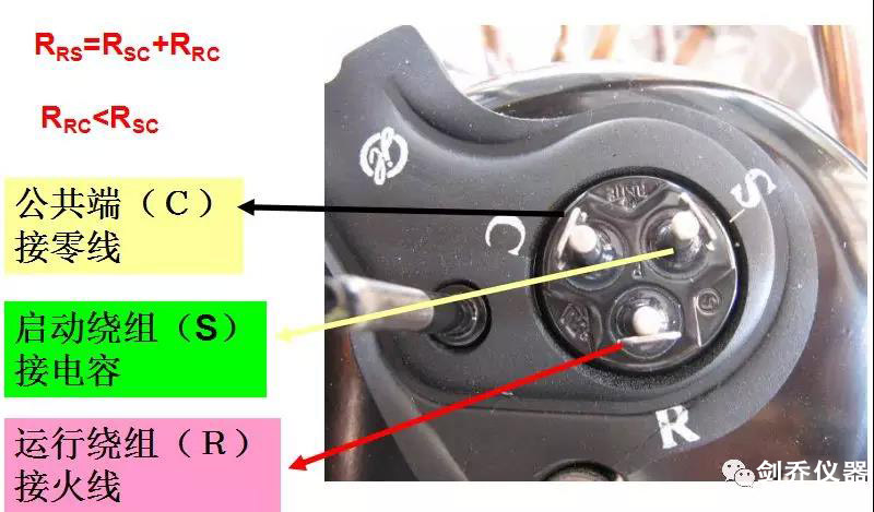 運行端(R),啟動端(S),公共端(C),RS間的電阻大于SC間的電阻大于RC間的電阻。RS間電阻等于SC間電阻加RC間的電阻。利用上述規律可以予以判別。需要說明的是三相壓縮機的接線端子電阻值是相等的。
