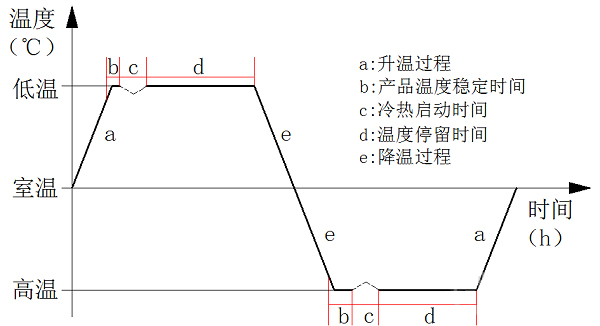 熱循環試驗是一種利用高低溫交變濕熱試驗箱對試驗產品進行的預設高低溫交替的應力考核,用以驗證材料和產品是否達到在研發、設計、制造中預期的質量目標的一類可靠性試驗。通過大溫變速率可暴露產品潛在的材料與性能缺陷,經過不斷地質量改進,達到可靠性提升的目的。航天單機類產品一次熱循環示意圖見下圖1所示。